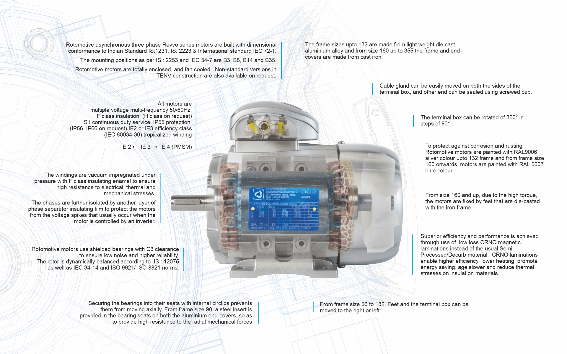 Revvo IE2/IE3 series motors are asynchronous 3 phase motors offering high efficiency (IE2) and premium efficiency (IE3) and are built with dimensional conformance to IS:1231. IS:2223 and IEC72-1.  The mounting positions as per IS: 2253 and IEC34-7 are B3, B5, B14 and B35.